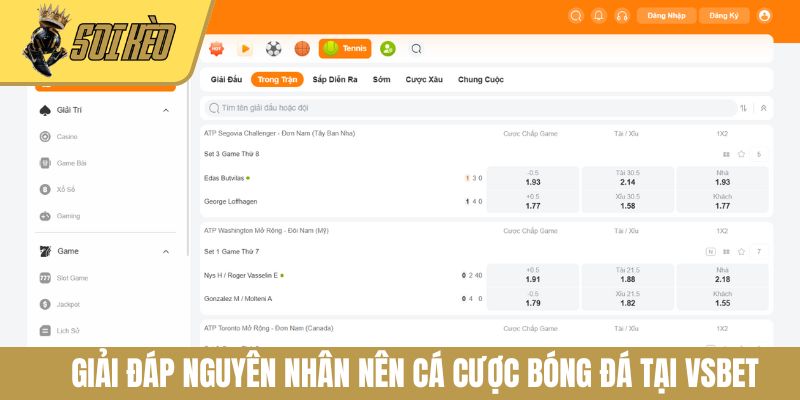 Tại đây, khách hàng có thể đặt cược vào vô vàn trận đấu đỉnh cao trên toàn cầu, từ Ngoại hạng Anh, La Liga, Serie A cho đến các giải đấu khu vực, cúp quốc nội hay cả những giải ít người biết đến. Hơn thế nữa, tỷ lệ kèo tại VSBET luôn được cập nhật kịp thời với mức ăn hấp dẫn, tạo điều kiện tối ưu để người chơi nâng cao tỷ lệ thắng.
